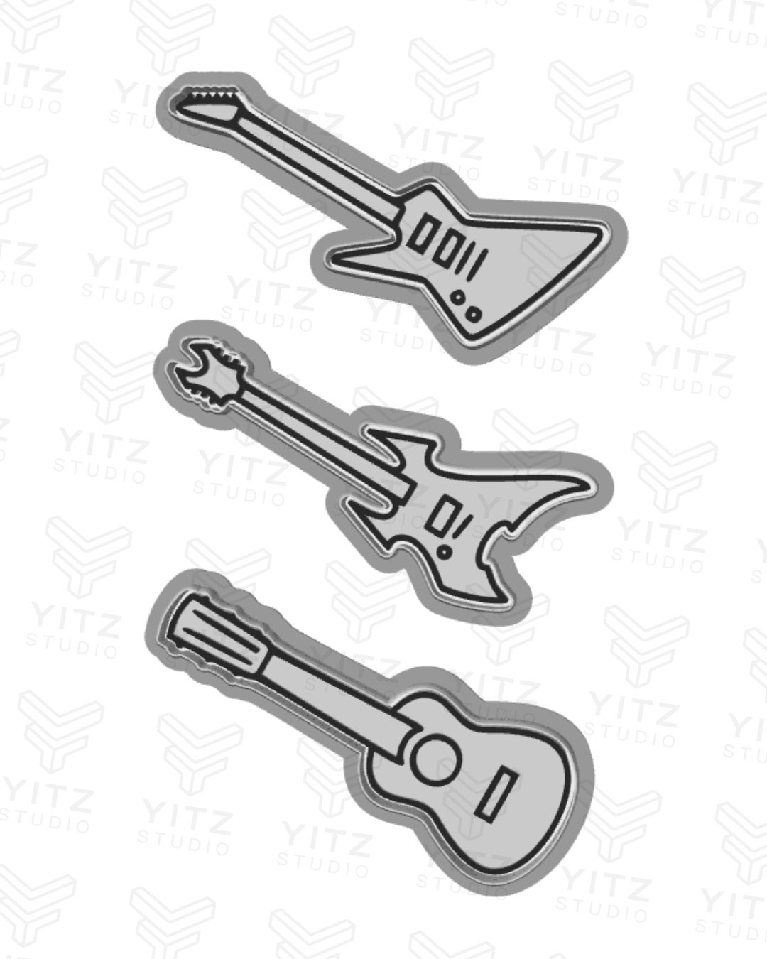 Contém: 3 cortadores de guitarra, baixo e violão com carimbos e puxador
